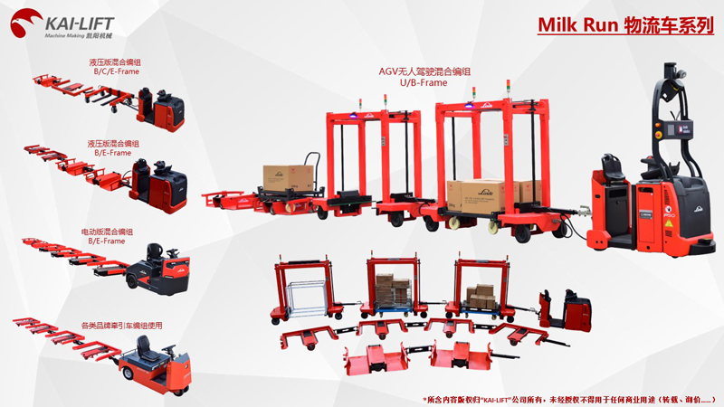 Milk run物流車系列從2012年開始試制至今,已發展了8年的歷史,由起初的單一產品E-Frame液壓版,KAI-LFIT擁有了E-Frame電動版、C-Frame液壓版、C-Frame電動版、B-Frame液壓版、B-Frame電動版、U-Frame、Y-Frame、O-Frame等多個系列產品,已形成系列化產品,滿足各類工況的使用要求,并且還支持非標定制,這極大的方便用戶對原來物流運輸模式的升級改造與優化,同時“KAI-LIFT”還提供國內外各品牌電動牽引車的改裝業務,有效的解除客戶顧慮,進一步節省客戶的投入成本與節省資源。